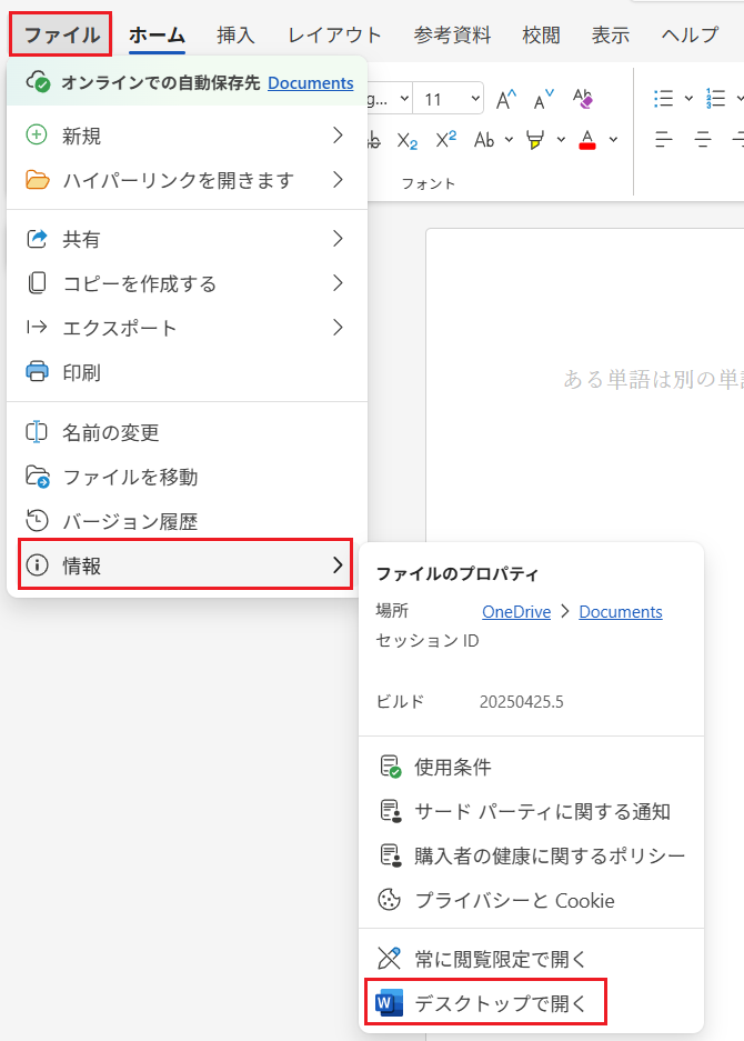 ・ブラウザ版Wordのタブで [ファイル] を選択し、[情報] を選択して [デスクトップで開く] を選択します。